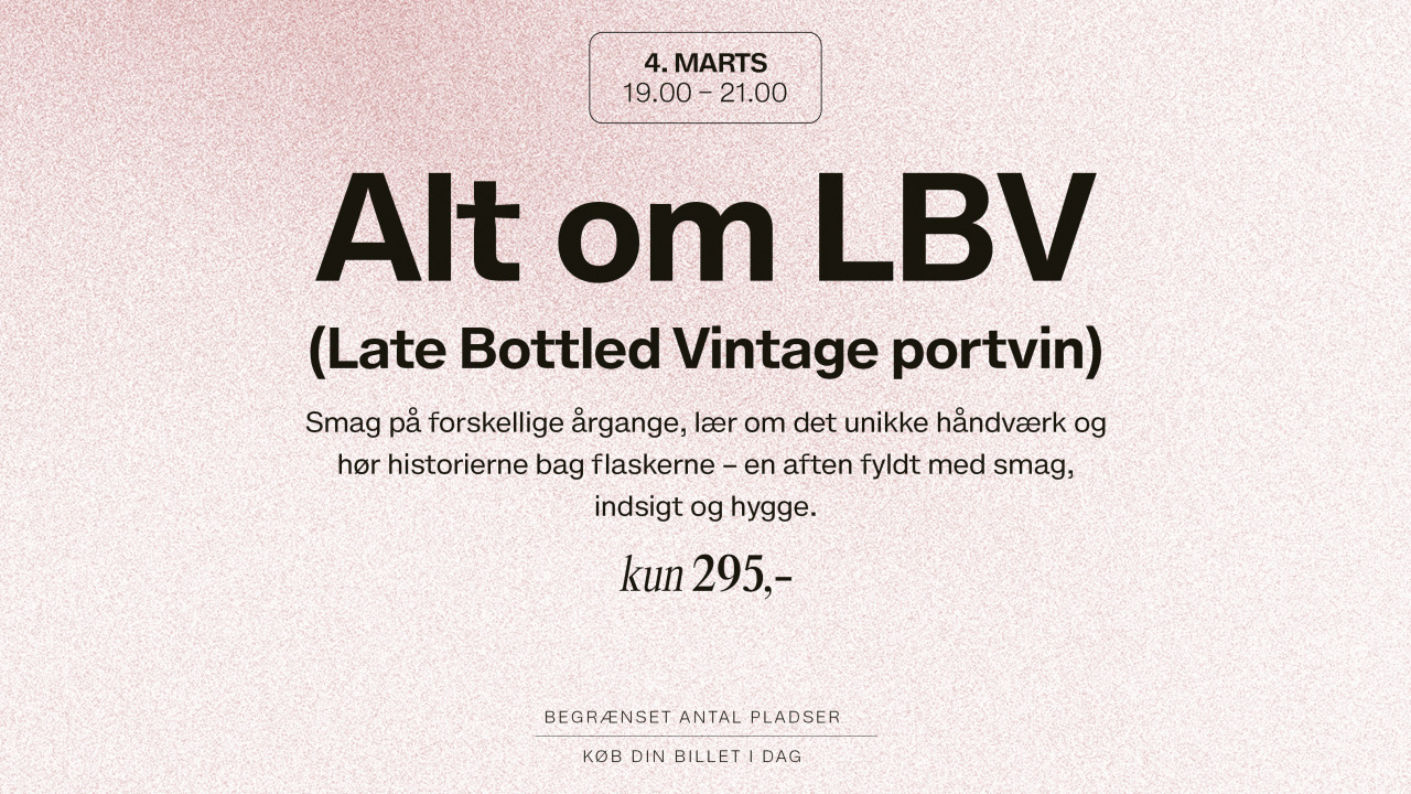 Smagning og historierUnder ledelse af den dygtige portvinssommelier, Jakob Søfelde-Hansen, vil deltagerne få mulighed for at smage på forskellige årgange af LBV portvin. Der vil være rig lejlighed til at lære om det unikke håndværk bag hver flaske og høre de fascinerende historier, der knytter sig til dem.